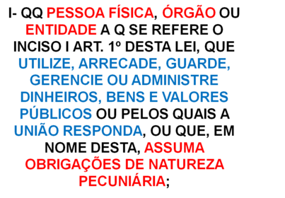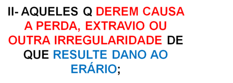 | LEI ORGÂNICA TCU ART. 5 A JURISDIÇÃO DO TRIBUNAL ABRANGE: | II- CUIDA DAQUELES Q DEREM CAUSA A PERDA, EXTRAVIO OU OUTRA IRREGULARIDADE DE Q RESULTE DANO AO ERÁRIO. MESMO Q A PESSOA NÃO SE ENQUADRE NO INCISO I, O SIMPLES FATO DE CAUSA DANO AO ERÁRIO A INCLUIRÁ NA JURISDIÇÃO DO TCU |