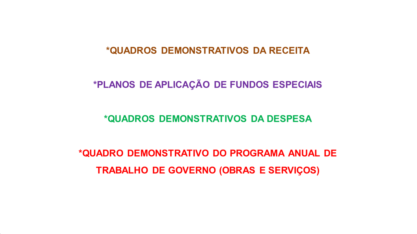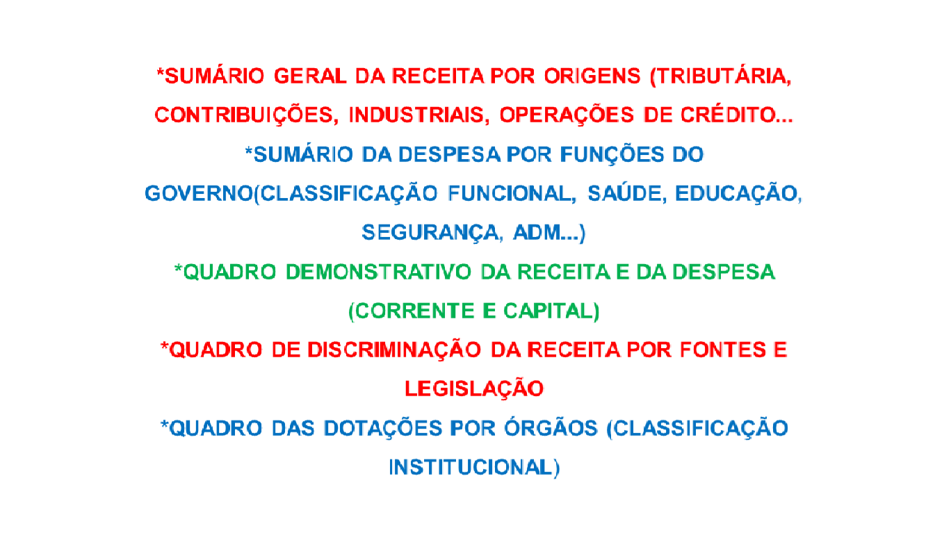 | O Q COMPREENDERÁ A LEI ORÇAMENTÁRIA? | *ORÇAMENTO FISCAL; *ORÇAMENTO DE INVESTIMENTOS; *ORÇAMENTO DA SEGURIDADE SOCIAL |