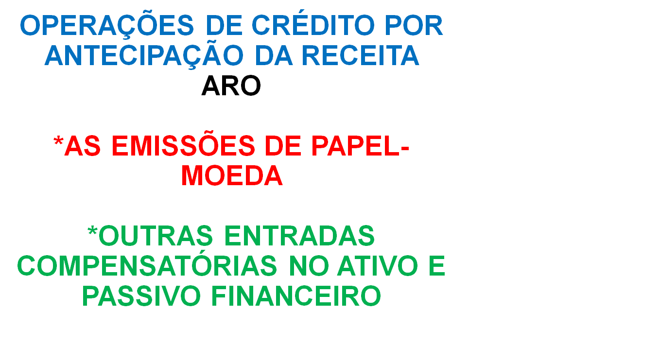 | ENTRADAS COMPENSATÓRIAS | *OPERAÇÕES DE CRÉDITO POR ANTECIPAÇÃO DA RECEITA ARO *EMISSÕES DE PAPEL MOEDA *RECEBIMENTO DE DEPÓSITOS JUDICIAIS *RECEBIMENTO DE CAUÇÕES DE LICITAÇÕES |