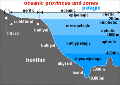 "Sea Zones" in order from surface to seafloor | Intertidal Zone Euphotic (Epipelagic) (True Light) Dysphotic Zone (Mesopelagic) (Twilight) Bathypelagic (no light |