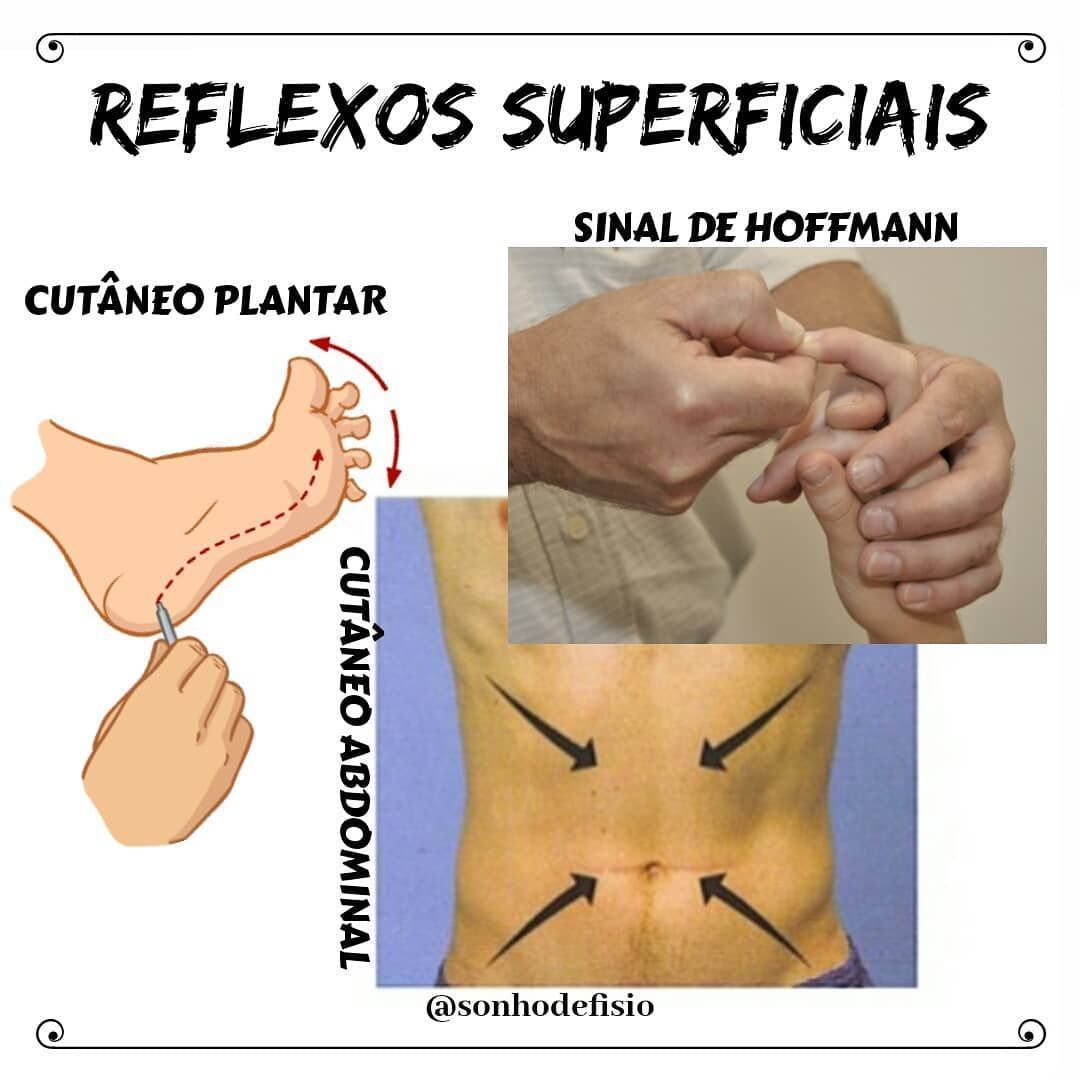 | QUAIS OS REFLEXOS EXTEROCEPTIVOS AVALIADOS? | 1. R. CUTÂNEO-PLANTAR 2. R. CUTÂNEO ABDOMINAL (normal = desloca cicatriz umbilical para o lado estimulado) |