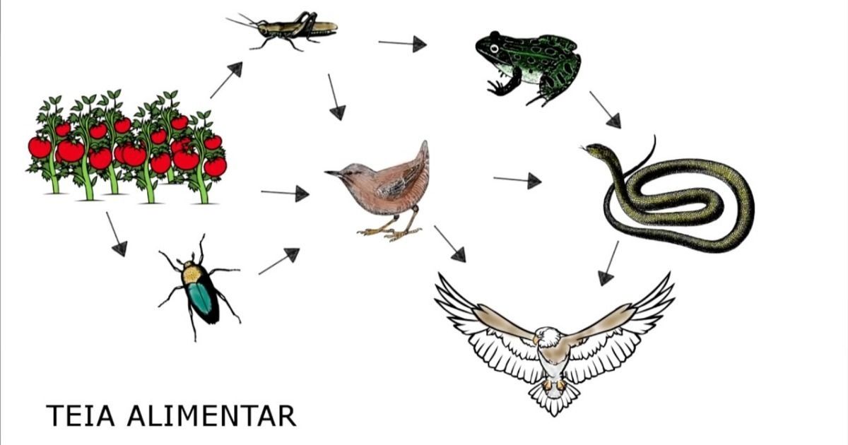 Exemplos: 1)planta-gafanhoto-sapo-cobra-gavião. 2)planta-gafanhoto-aranha-pássaro-cobra-gavião. 3)planta-roedor-lagarto-gavião. |