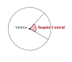 | Ángulo central en un círculo | Un ángulo central es un tipo de ángulo cuyo vértice es el centro O de una circunferencia, y cuyos lados son dos radios correspondientes a dos puntos distintos de la circunferencia A y B. Se dice que el ángulo central es subtendido por un arco entre esos dos puntos. |