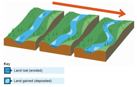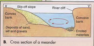 natural environment river landoforms meanders | In the middle stages of the river it has more energy to erode laterally. The fastest flow is on to the outside of the bend causing erosion by mainly hydraulic action. The slower flow is found in the inside of the bend where deposition takes place. these bands can migrate over time leading to wide flat valleys |