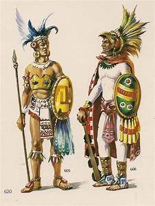 Os homens usavam tangas, capa e sandálias. As mulheres trajavam saias e blusas sem mangas. Desenhos coloridos nas roupas revelavam a posição social de cada asteca. |