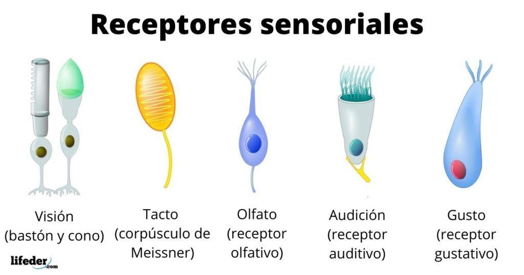 | Tipos de receptores + Por el estímulo que perciben: - Mecanorreceptores: Perciben tacto - Quimiorreceptores: Perciben olores y gusto - Fotorreceptores: Perciben luz - Nociceptores: Perciben dolor - Termorreceptores: Perciben temperatura | |