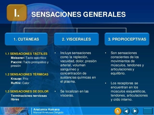 | + Por su especificidad - Sensaciones generales: Cutáneos, viscerales, propioceptivas - Sensaciones especiales: Olfato, gusto, audición, vista | |