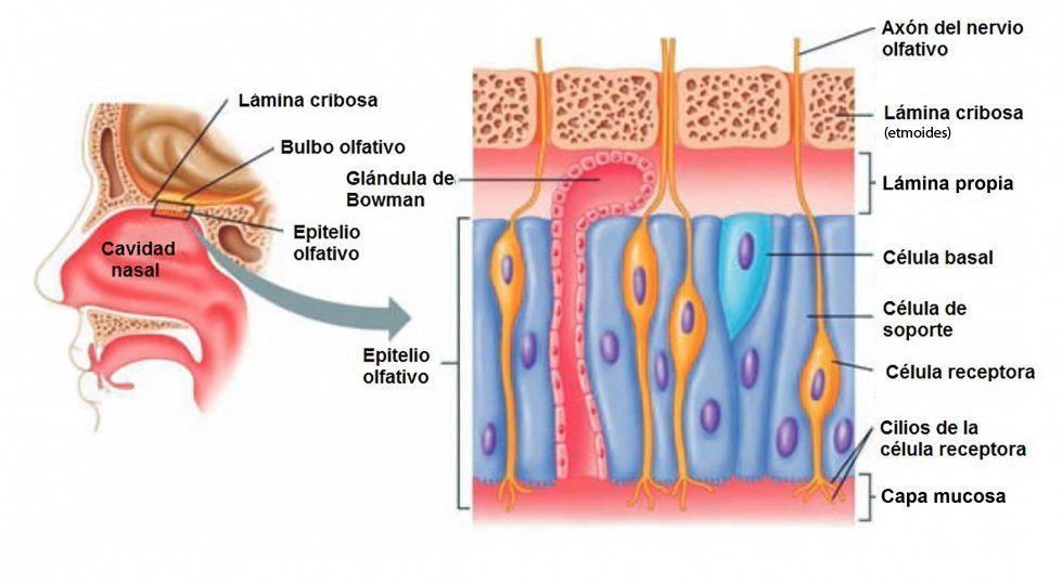 | - Epitelio olfatorio: a.- Células basales: Origina células sustentaculares b.- Células sustentaculares: Sostiene a las células olfatorias c.- Célula olfatoria: Percibe olores | |