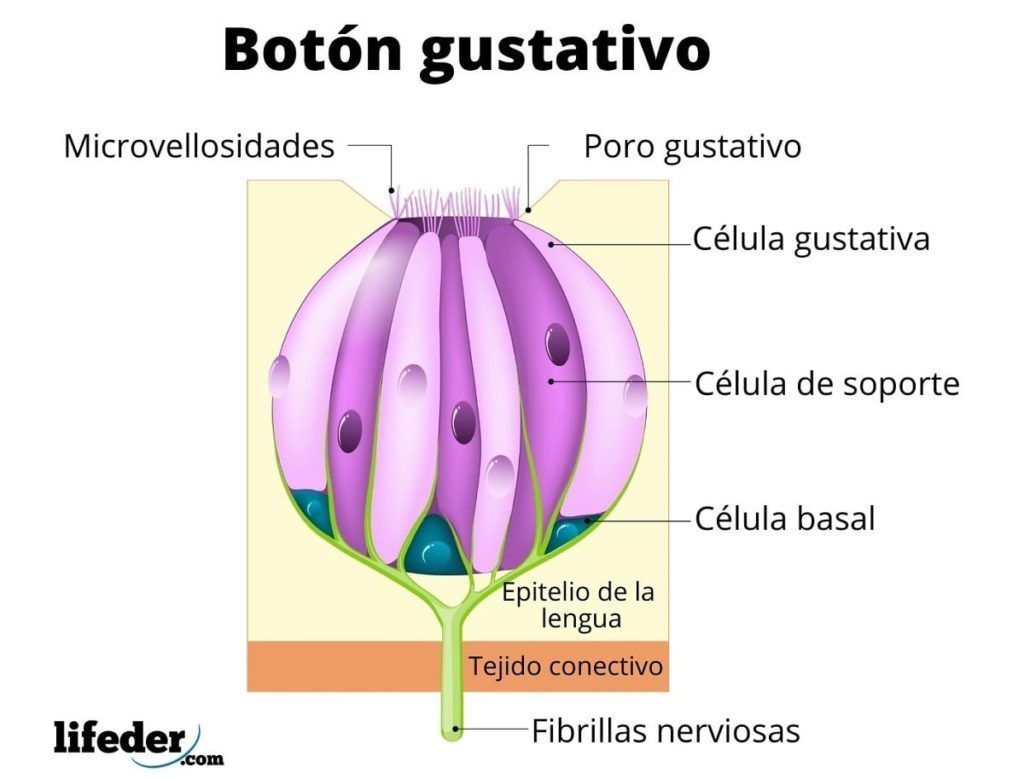 | B.- Gusto: Percibe sabores 1.- Botón gustativo: - Célula basal: Originan a las células sustentaculares - Célula sustentacular: Sostienen a las células neuroepiteliales - Célula neuroepitelial: Perciben sabores | |