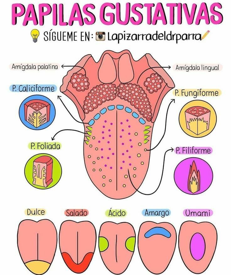 | 2.- Papilas linguales : a.- Caliciformes: Son de 8 a 12 presentan 100 botones , forman la v lingual b.- Fungiformes: Se ubican en la punta y lados de la lengua, presentan 5 botones c.- Filiformes: Carecen de botón gustativo, se ubican en los 2/3 anteriores de la lengua | |