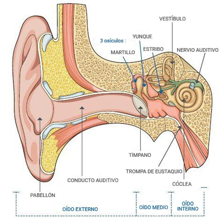 1.- Oído externo a.- Pabellón auricular: Estructura con forma de embudo , conduce las ondas sonaras al interior del CAE b.- Conducto auditivo externo: Conduce las ondas sonaras al tímpano, 1/3 es cartílago elástico y 2/3 hueso temporal |