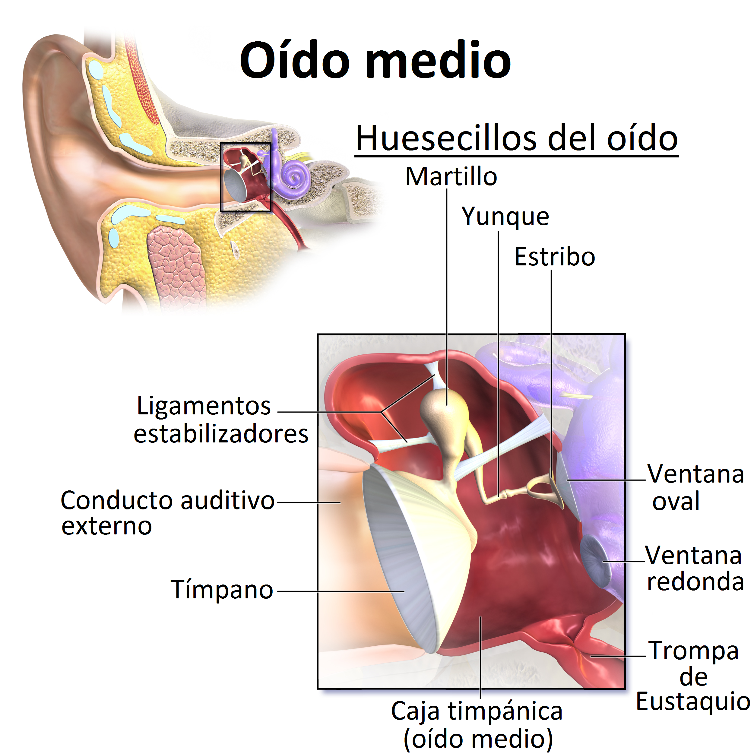 | 2.- Oído medio: a.- Membrana timpánica: -se ubica entre oído externo y oído medio - Tiene forma de cono aplanado - Se une al hueso martillo b.- Cavidad timpánica : - Se ubica dentro del hueso temporal - Aloja a los huesecillos del oído medio | |