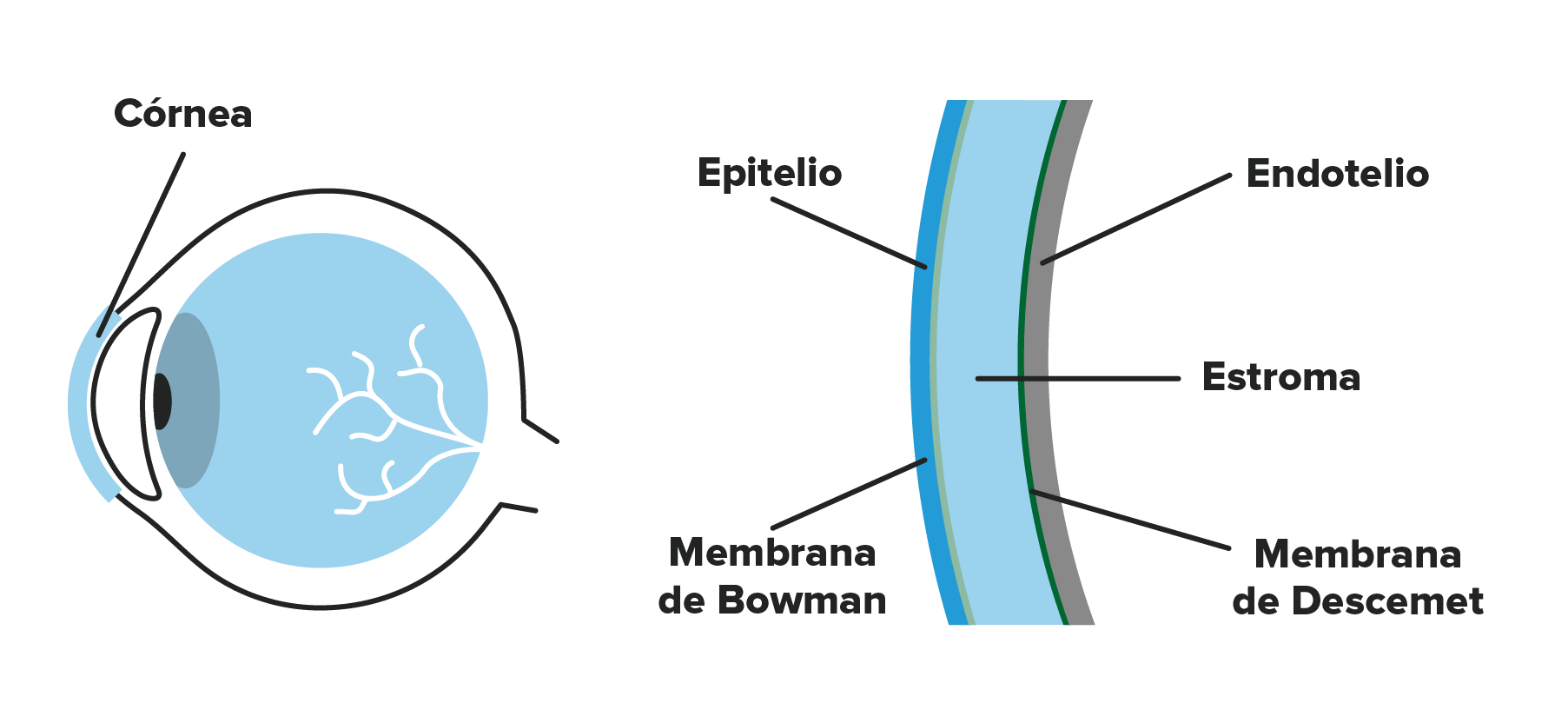 a.- Túnica fibrosa : Es la más externa + Córnea: Es transparente y avascular - La superficie corneal es lisa y si se arruga se llama astigmatismo - Presenta 5 capas: Epitelio corneal ,Membrana de bowman, Estroma, membrana de descemet y endotelio corneal , ocupa el 1/6 anterior |