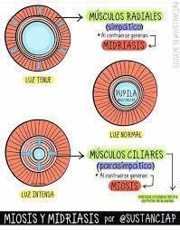 | b.- Túnica vascular o úvea: + Iris: Brinda color al ojo (melanina) - La abertura central se llama pupila - Miosis, esfínter de la pupila (SN. parasimpático) - Midriasis , músculo radial (SN. simpático) | |