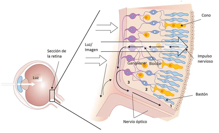 | C.- Túnica nerviosa : llamada retina - Bastones: Perciben imágenes con poca luz, se usa la proteína rodopsina.. - Conos: Perciben imágenes con mucha luz, se usa la eritropcina (rojo), cloropsina (verde), cianopsina (azul) * En el nervio óptico esta el punto ciego * C. ganglionares, originan el nervio óptico | |