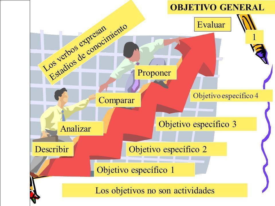 | Objetivos Es una meta o propósito La respuesta al problema planteado | Características de los objetivos - Actividades a ejecutar para responder a la pregunta del problema - Deben ser precisos - Deben ser coherentes con el planteamiento del problema - Deben ser alcanzables |