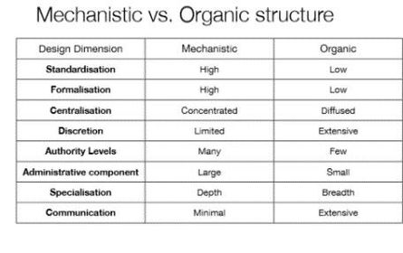 | Mechanistic or Organic | Mechanistic - hierarchical (tall) Organic (fluid, fewer authority, fewer regulations, location of authority can change) |