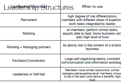 | Self-organising teams | Complete responsibility for production make their own managerial decisions loosely-coupled (freedom, autonomy, less demarcation) Set up when companies are seeking innovation |