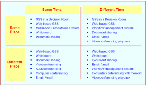 | Group Support Systems GSS | Information retrieval Information sharing (parallelism, anonymity) Information use Support participants (improve productivity and effectiveness) |
