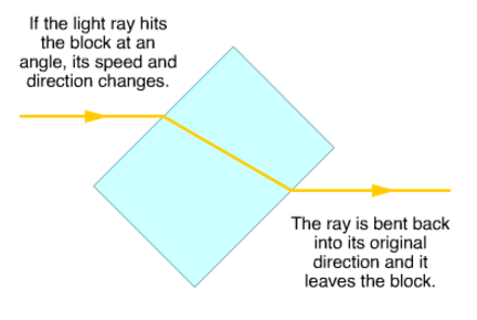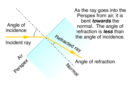 | Refraction | When light passes at an angle from one transparent medium to another of a different density it changes direction. |
