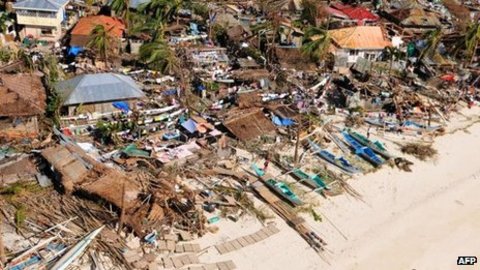 | On Sunday, the death toll in the Philippines was believed to be 2000 people dead in Tacloban city. | A storm surge caused sea waters to rise 6 metres[20 feet] when the typhoon hit Friday. |