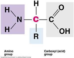 | what does an amino acid contain? | an amino group. an R group. an carboxylic acid. |