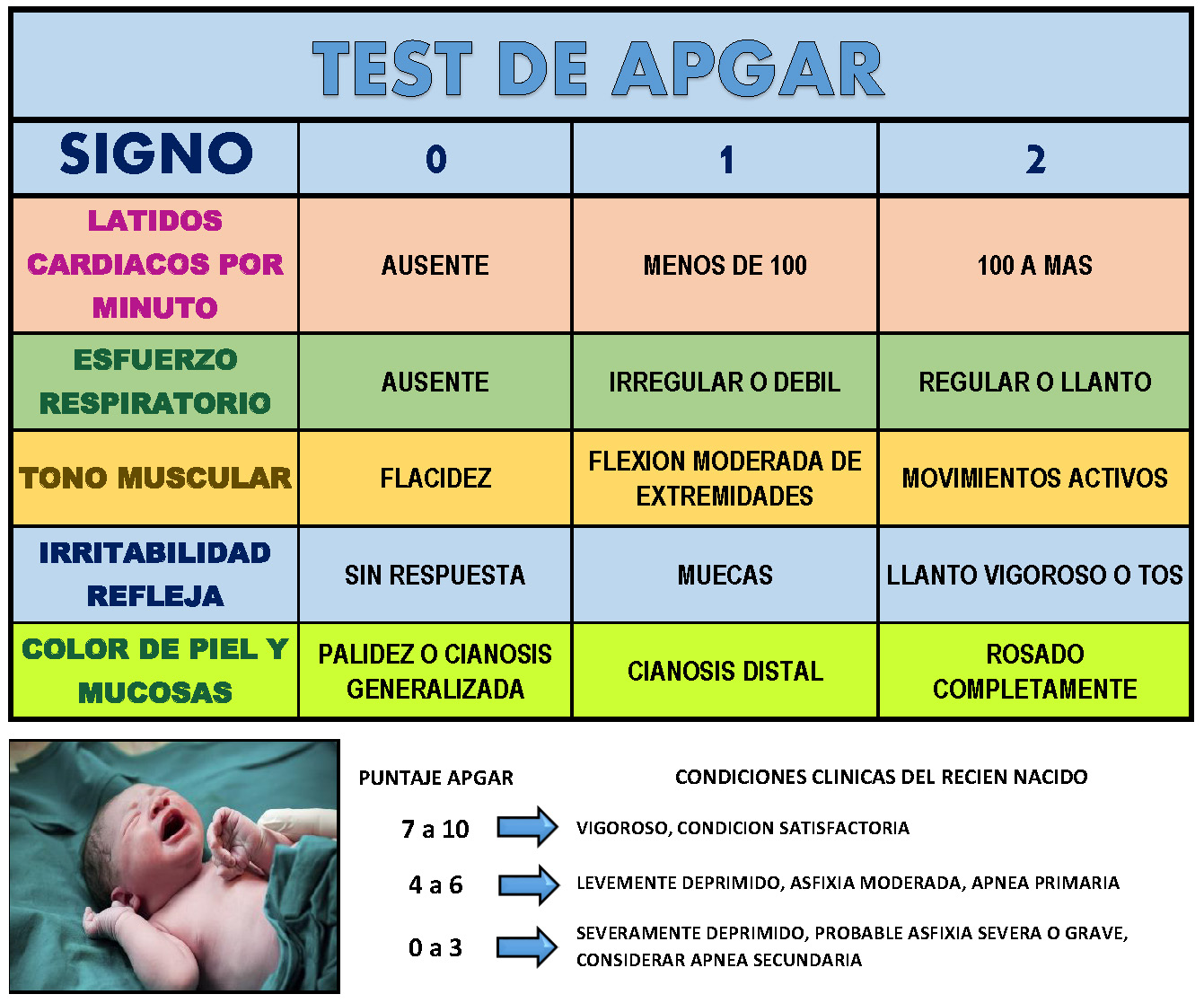 ¿ Cuando se debe realizar? Se realiza en el primer y en el quinto minuto de vida (se repite cada 5 minutos siempre que el resultado sea < 7). Esta evaluación lo realiza el pediatra o enfermero que asiste al recién nacido. | ¿Qué implicaciones para el futuro tiene la puntuación en el test de Apgar? Es una herramienta para evaluación rápida del estado del recién nacido después del nacimiento; no predice el estado de salud futuro del recién nacido. |
