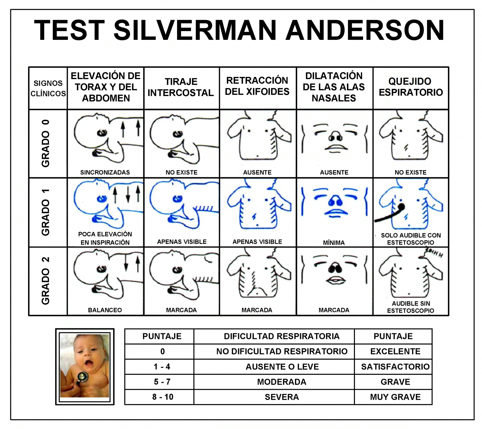 ¿Que es el test de Silverman? El test de Silverman y Anderson es un examen que valora la función respiratoria de un recién nacido, basado en cinco criterios. ¿ Cuando se debe realizar? Es recomendable que se evalué al niño dentro de la primera hora de vida y dentro de la primera media hora de vida en los neonatos pretérmino, con alguna dificultad respiratoria, aspirado de líquido en el parto, etc. | ¿Que mide esta prueba? Valora cinco parámetros: Elevación de tórax y del abdomen. Tiraje intercostal Retracción del xifoides Dilatación de las alas nasales Quejido espiratorio Cada parámetro es cuantificable y la suma total se interpreta en función de dificultad respiratoria. |