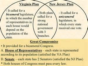 | New Jersey Plan | an alternative plan to the Virginia Plan; called for a unicameral legislature; each state would have one vote. |