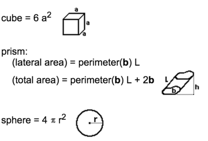 | What are the formulas for finding the surface area of a cube, prism, and sphere? |