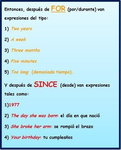 | Example "for": | For + a period of time For can be used with the past simple or present perfect. It speaks of a period of time, as in Spanish during. I've lived in Hong Kong for 10 years. She worked there for just 3 months. They walked for a couple of hours. He has been with his girlfriend for several years. |