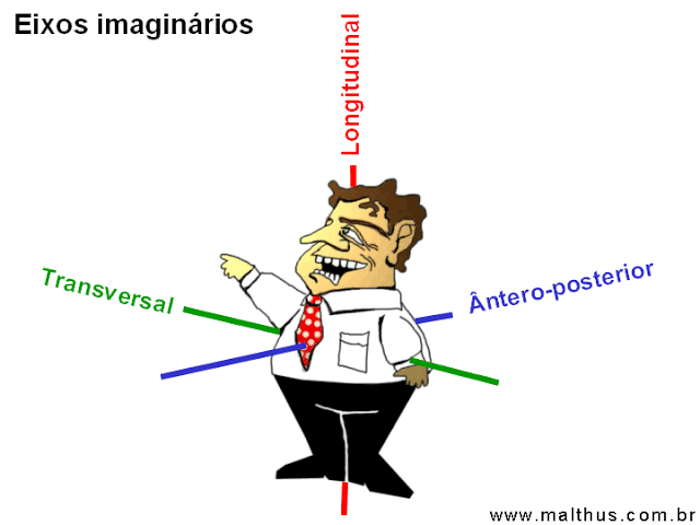 | Eixo: -Permite movimentos de flexão e extensão; -Permite movimento de Abdução e adução; -Permite movimento de rotação. | Eixo: •Látero-Lateral ou transversal •Ântero-posterior ou sagital •Longitudinal ou Crânio-Caudal |