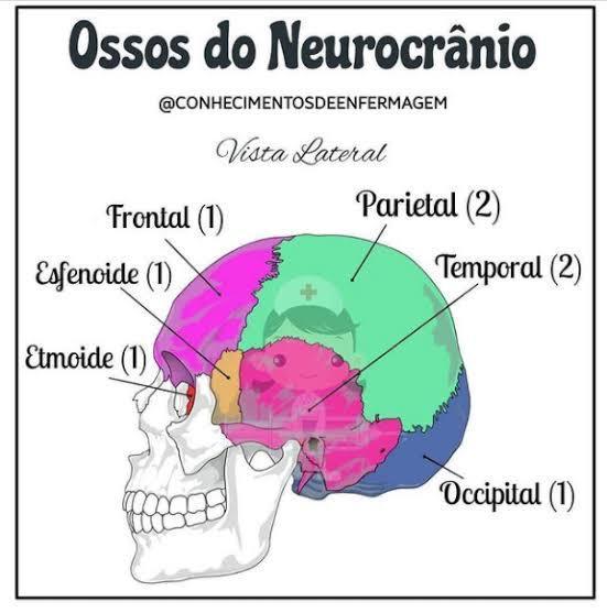 | Ossos do Neurocrânio (8) | • Parietal (2) • Temporal (2) •Frontal •Occipital •Esfenóide •Etmóide |