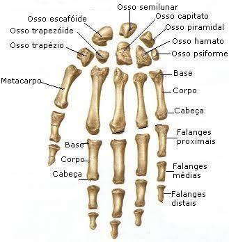 | Ossos do carpo (8) | 1 Trapézio 2 Trapezóide 3 Escafóide 4 Semilunar 5 Capitato 6 Hamato 7 Piramidal 8 Psiforme |