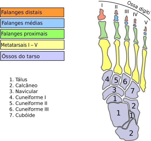 | Ossos do Tarso (7) | 1 Tálus 2 Calcâneo 3 Navicular 4 Cuneiforme Medial 5 Cuneiforme Intermédio 6 Cuneiforme Lateral 7 Cubóide |