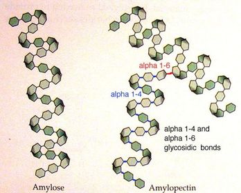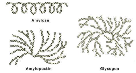 | describe amylopectin | has 1-4 and 1-6 bonds, creates branched chains and spirals, coils into storage |