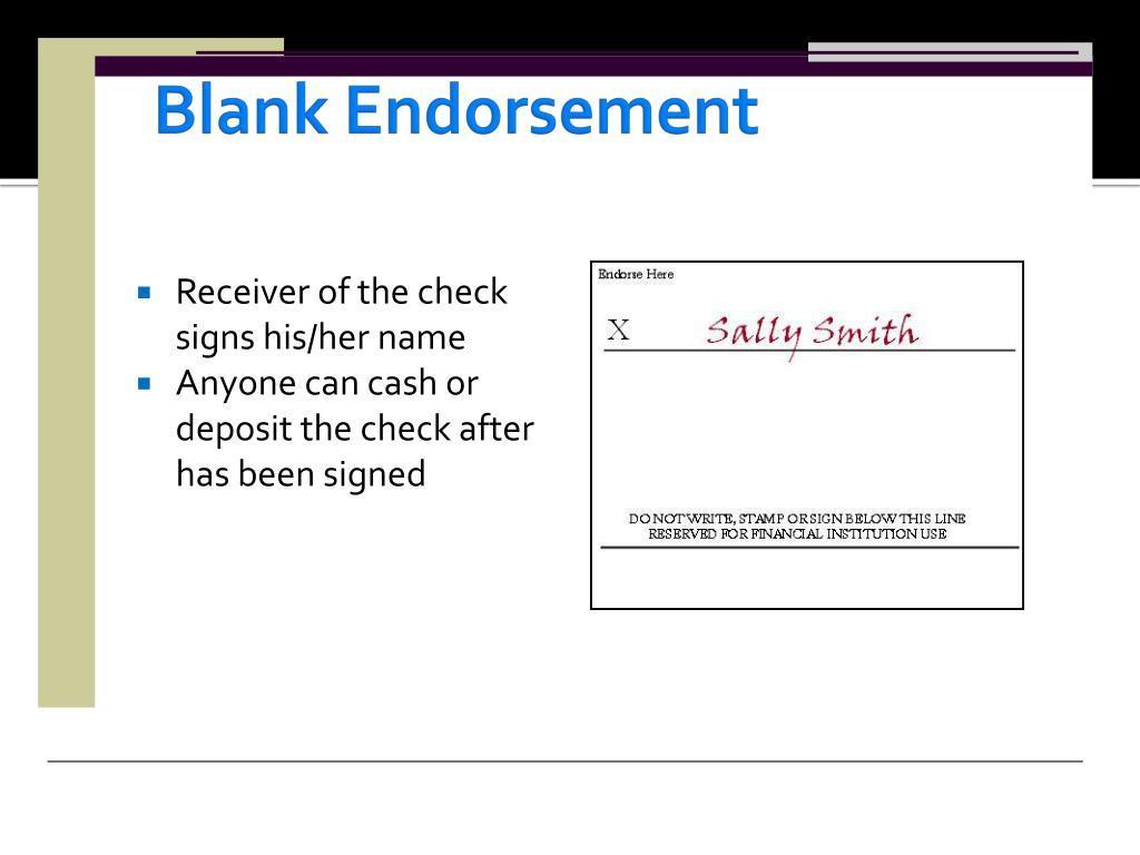 Blank endorsement | Current owner of check signs name on back. Whoever presents checks for payment received the money. |