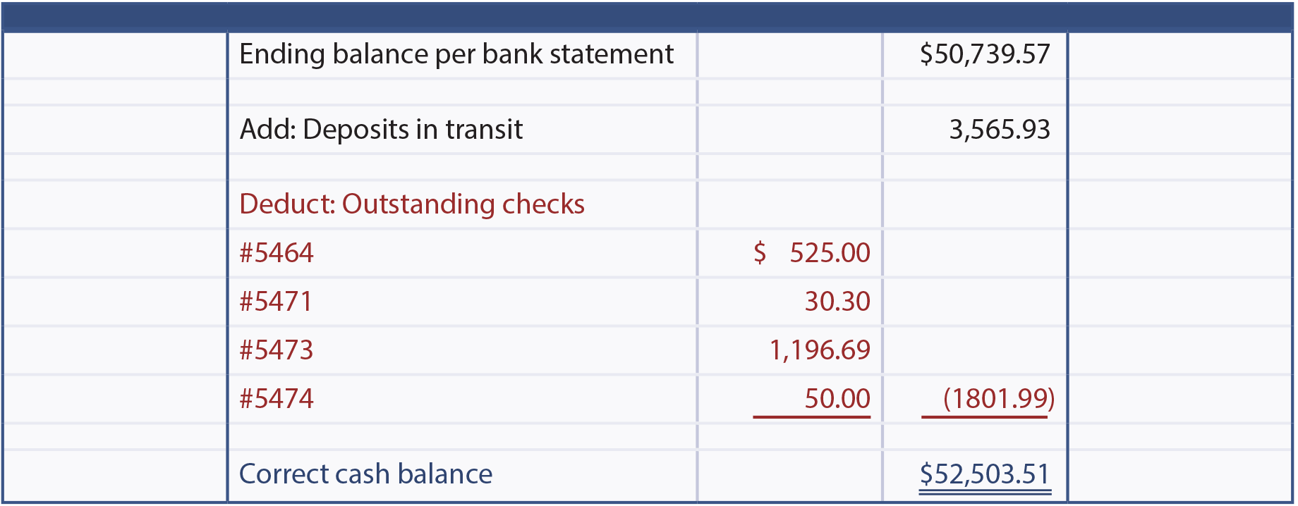 Outstanding checks | Checks written but not yet processed by the bank before bank statement preparation |