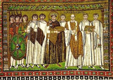 | Emperor Justinian and attendants, and Empress Theodora and attendants, mosaics, c. 547, San Vitale, Ravenna. | |