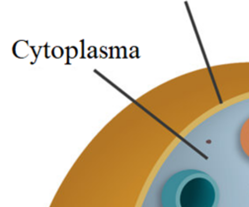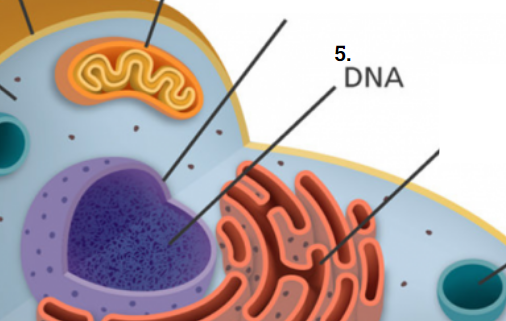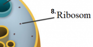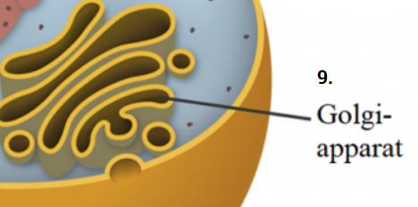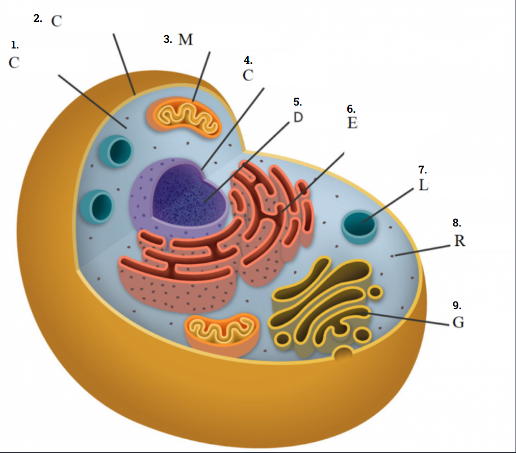 1- Cytoplasma, 2- Cellmembran, 3- Mitokondrie, 4- Cellkärna, 5- DNA, 6- Endoplastiskt nätverk, 7- Lysosom, 8- Ribosom, 9- Golgiapparat. |