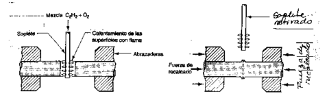 21. Describe cómo se pueden unir dos cilindros metálicos | Con soldadura a tope, que consiste en la unión de dos piezas que se colocan extremo con extremo con la misma sección, éstas se presionan cuando está pasando por ellas la corriente eléctrica, con lo que se genera calor en la superficie de contacto. Con la temperatura generada y la presión entre las dos piezas se logra la unión. |