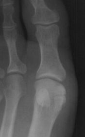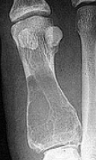Describe this lesion | A lytic lesion of the proximal phalanx that appears quite aggressive due to bone loss; however, the well-defined margins of the bone suggests a soft tissue tumor causing pressure atrophy against adjacent bone |