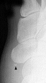 What disease is this? What does the arrow show? | Non-articular psoriatic arthritis Arrow = 'fluffy spur' |