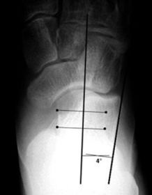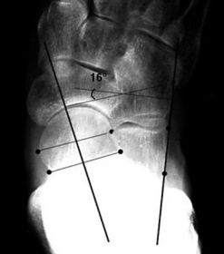 What is this angle called? What is normal? What does an increased angle indicate? | Talo-calcaneal angle. 25-45 degrees. Increased angle = hindfoot valgus |