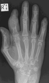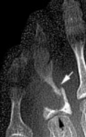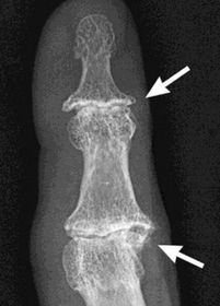 What disease is this? What indicates this? | Tophaceous gout. Soft tissue swelling surrounding the index finger PIPJ, with associated erosion and bone resorption |