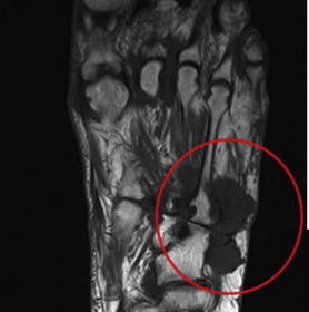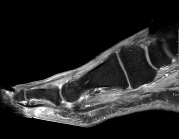 What does the arrow show? What could this be? | Teardrop-shaped hypointense lesion in third interspace. Could be morton's neuroma |