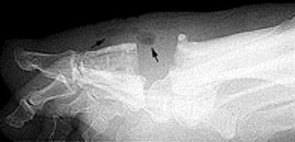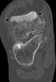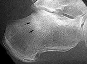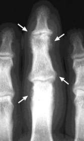 What disease is this? What do the arrows indicate? | Gout Arrows = 'punched out' erosions |