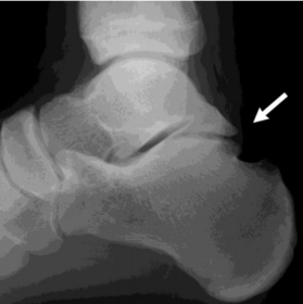 What disease is this? What does the arrow indicate? | Rheumatoid arthritis. Arrow = Bone erosion secondary to inflammation of retrocalcaneal bursa. |