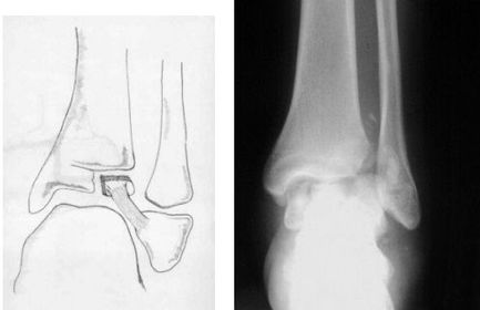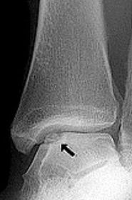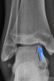 What type of fracture is this? How does it occur? | Tillaux fracture - a fracture of the anterolateral tibial epiphysis that is commonly seen in adolescents. The fragment is avulsed due to the strong ATF ligament in an external rotation injury of the foot. |