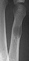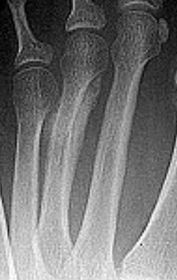 Describe what has happened at the shaft of the 3rd met | Exuberant periosteal new bone production. May have resulted if a stress fracture was not treated and the patient continued weight bearing activities. |